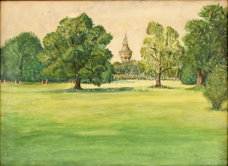 Rózsa jelzéssel: Margitszigeti rét, háttérben a víztoronnyal. Akvarell, ceruza, papír. Üvegezett, kopott fa keretben. 35,5x47,5 cm