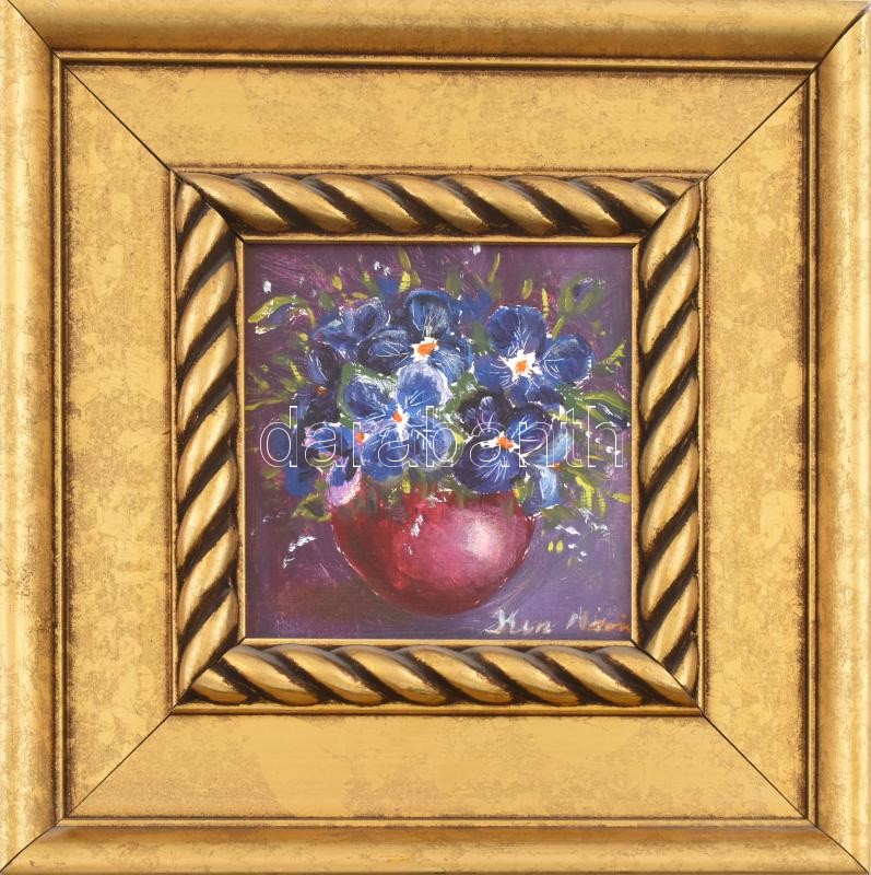 Kun Mária (1944-): Csendélet virágokkal. Olaj, farost, jelzett. Dekoratív fa keretben. 15x15 cm