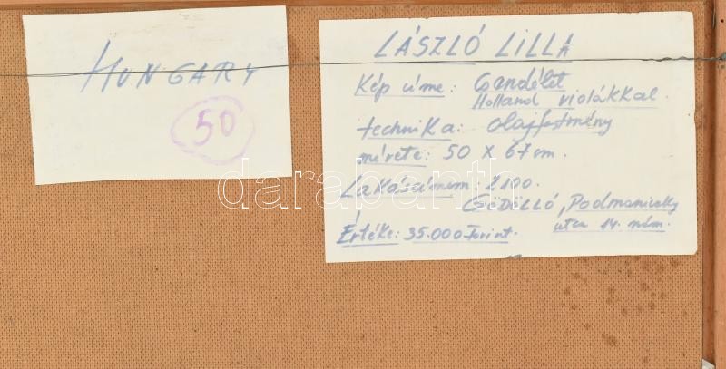 László Lilla (1940-): Csendélet holland violákkal. Olaj, farost, jelzett. Hátoldalán autográf felirattal. Fa keretben, 50×67 cm. KiállÃtva: Házat-Hazát AlapÃtvány Jótékonysági kiállÃtás és vásár, 1997. Reprodukálva: Házat-Hazát AlapÃtvány Jótékonysági kiállÃtás és vásár, 1997, katalógus 20. o. Jótékonysági árverés a Házat-Hazát AlapÃtvány otthonteremtési programjának támogatására.