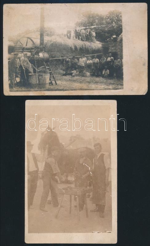 Description: cca 1924-28 össz 4 db fotólap, 1 db aratáskor, 2 db gépek mellet álló emberek, 1 db lópatkolás közben dolgozó kovácsokat ábrázol. Többségében a hátoldalán datált. Kopott, kisebb felületi sérülésekkel. 14x9 cm