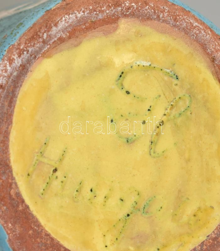 Description: Gorka Lívia (1925-2011): Zöld, narancs, fehér halas váza. festett mázas kerámia, jelzett, kis mázlepattanásokkal a száján. / Livia Gorka (1925-2011): Vase with fish. Hand painted ceramic with small faults on glaze m: 24,5 cm.