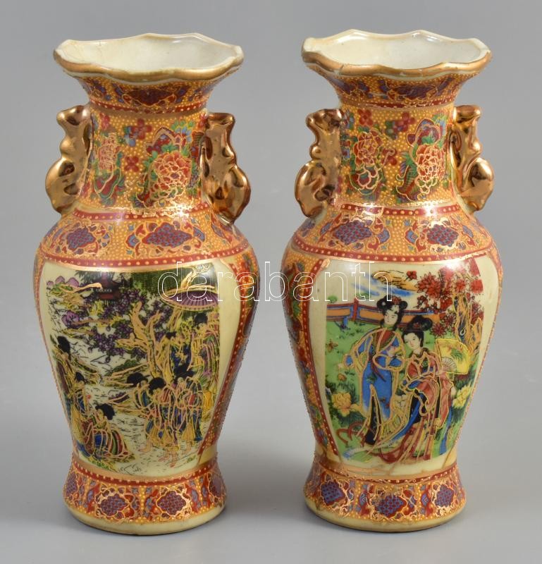 2 db szacuma váza. Kézzel festett, jelzett, mindkét felső részén javított sérüléssel,. m: 20,5 cm