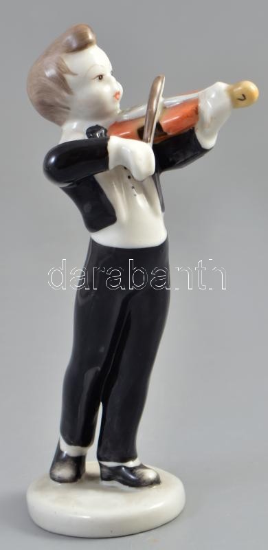 Hollóházi porcelán hegedűs kisfiú, kézzel festett, jelzett, apró kopással, m: 14,5 cm