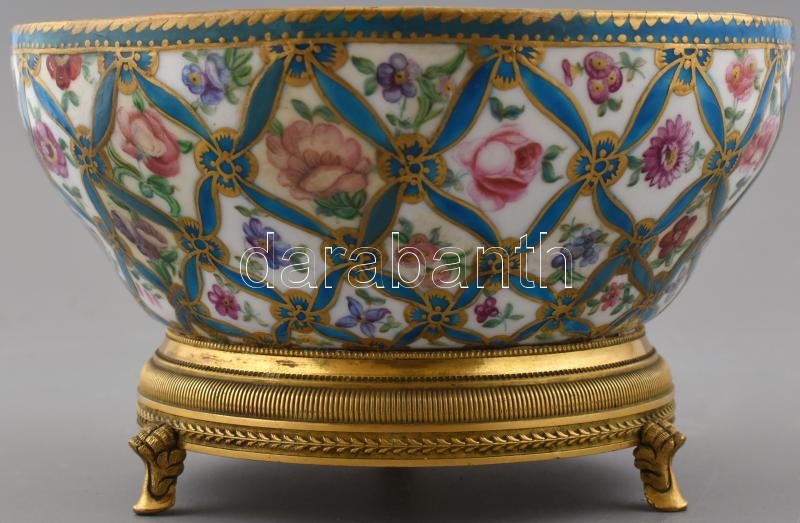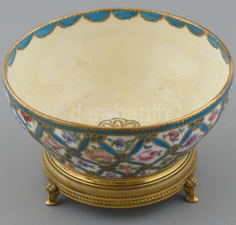 Sévres fajansz tálka réz lábakon. XIX. sz. Franciaország. Kézzel festett, jelzett, hajszálrepedéssel. d: 15 cm