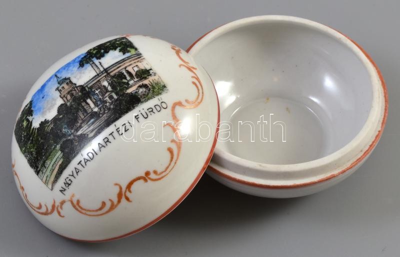 Zsolnay bonbonniere. Nagyatádi artézi fürdő képével. Matricás, jelzett...