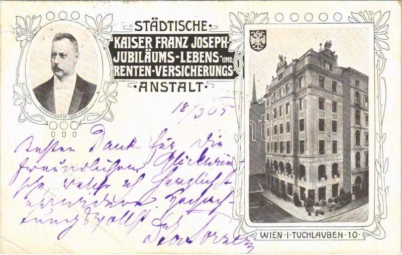 1905 Wien, Vienna, Bécs; Städtische Kaiser Franz Joseph-Jubiläums-Lebe... https://www.darabanth.com/en/395-Online-auction/395.0/Postcards/Austria~1000021/1905-Wien-Vienna-Becs-Stadtische-Kaiser-Franz-Joseph-Jubilaums-Lebens-und-Renten-Versicherung~II2398502