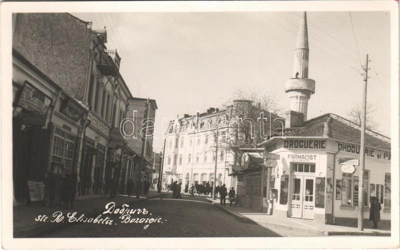 1940 Dobrich, Dobrits, Str. R. Elisabeta Bazargic / street, mosque, droguerie (Farmacist N. Costov), pharmacy. photo