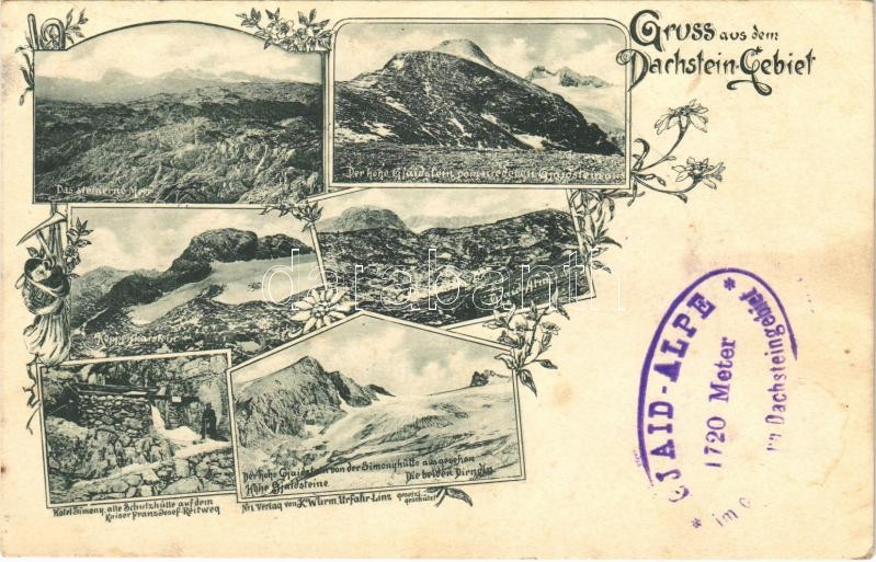 Dachstein-Gebiet, Das steinerne Meer, Der hohe Gjaidstein, Koppenkarstein, Karl Simony, alte Schutzhütte auf dem Kaiser Franz Josef-Reitweg, Der hohe Gjaidstein von der Simonyhütte aus gesehen, Hohe Gjaidsteine, Die beiden Dirndln. Verlag K. Wurm No. 1. Art Nouveau, floral (fl)