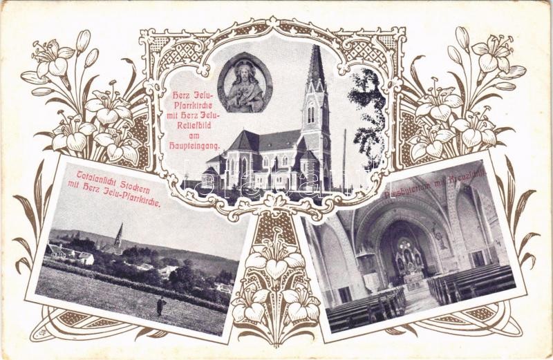 Stockern (Meiseldorf), Neue Herz Jesu-Pfarrkirche, Reliefbild am Haupteingang, Presbyterium mit Kreuzschiff / church interior. Art Nouveau, floral
