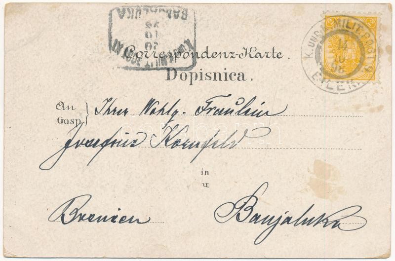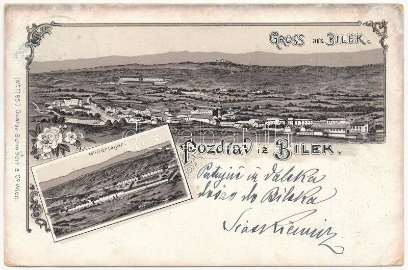 1898 (Vorläufer) Bileca, Bilek; Militär Lager / military barracks. Gustav Schubert & Co. No. 1185. Art Nouveau, floral, litho (EK)