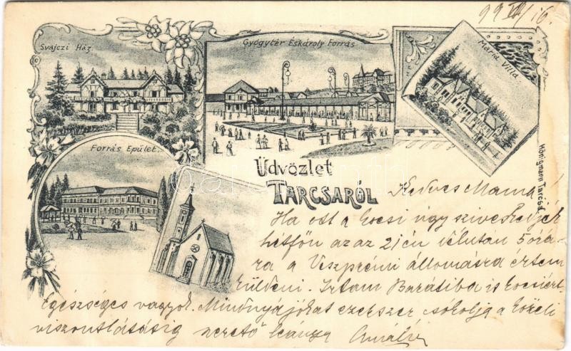 Description: 1899 (Vorläufer) Tarcsa, Tatzmannsdorf; Svájci ház, Forrás épület, Gyógytér és Károly forrás, Maria Villa Hönigmann kiadása / villa, spa, spring. Art Nouveau, floral