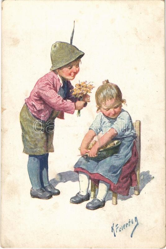 1919 Children art postcard, romantic couple. B.K.W.I. 982-3. s: K. Feiertag (fl)