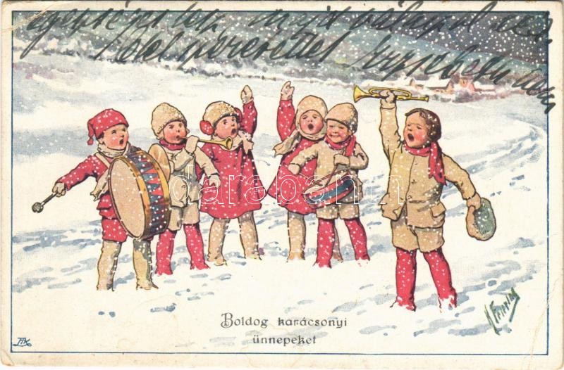 1921 Boldog Karácsonyi ünnepeket / Children art postcard with Christmas greeting, music band. B.K.W.I. 3207-1. s: K. Feiertag (EB)