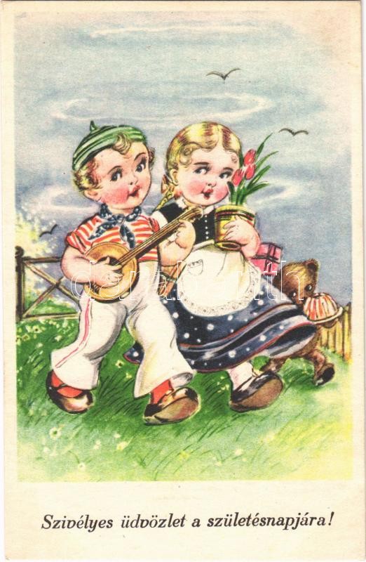Szívélyes üdvözlet a születésnapjára! / Children art postcard with Birthday greeting