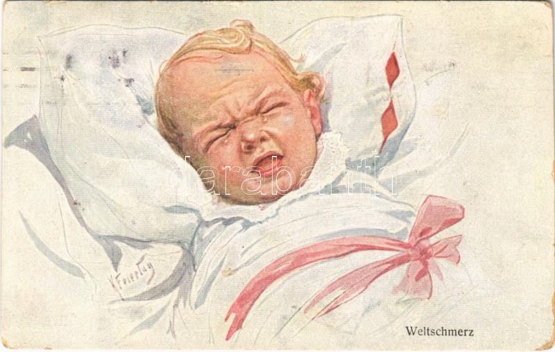 Weltschmerz / Children art postcard with crying baby. B.K.W.I. 977-4. s: K. Feiertag (kopott sarkak / worn corners)