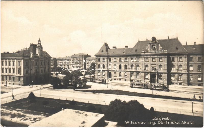 Zagreb, Zágráb; Wilsonow trg., Obrtnicka skola / square, school, trams