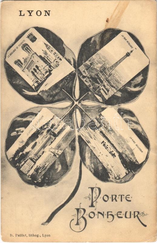 Lyon, Porte Bonheur / multi-view greeting card with four-leaf clover. ...