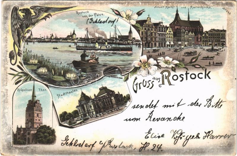 1898 (Vorläufer) Rostock, Neuer Markt und Marienkirche, Stadttheater, Kröpeliner Thor / market square, church, theatre, gate tower. Friedrich Androff Art Nouveau, floral, litho (EK)