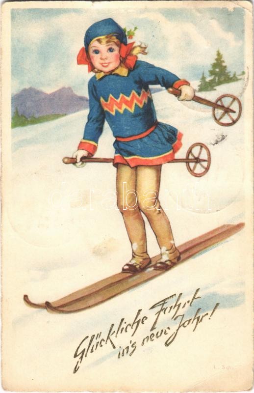 1931 Glückliche Fahrt in's neue Jahr! / New Year greeting art postcard, ski, winter sport (EB)