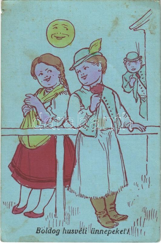 Boldog húsvéti ünnepeket! / Easter greeting art postcard, Hungarian folklore, romantic couple (kis szakadás / small tear)