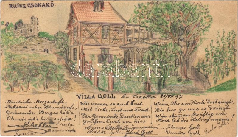 1897 (Vorläufer) Csókakő, Goll Villa, várrom. Kézzel rajzolt képeslap+...