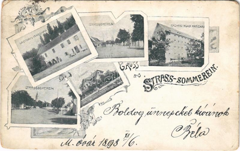 1898 Hegyeshalom, Strass-Sommerein, Straß-Sommerein; Gasthaus Marienau, Erzherz. Mühle Marienau, Bahnhof / Fő utca, vasútállomás, vendéglő és főhercegi malom Márialigeten. Art Nouveau, floral (EM)