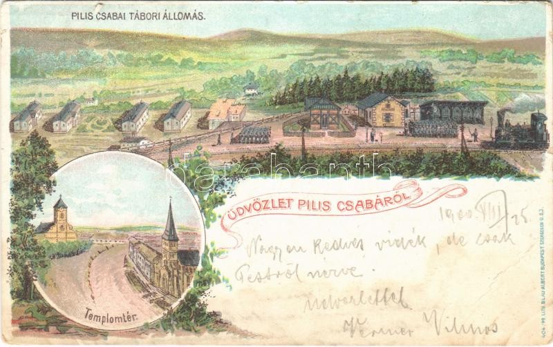 1900 Piliscsaba, Tábori vasútállomás, gőzmozdony, vonat, Templom tér. Lith. Blau Albert 404/99. Art Nouveau, litho (EB)