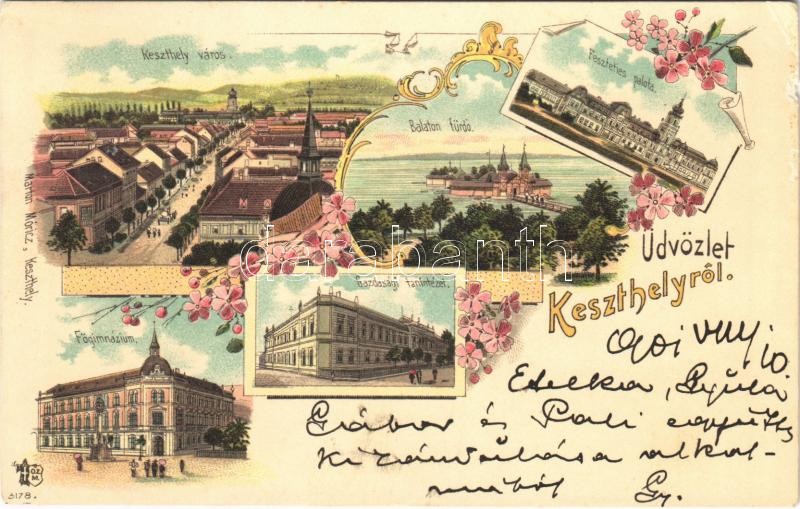 Description: 1901 Keszthely, főgimnázium, Fő utca, Balaton fürdő, Gazdasági tanintézet, Gróf Festetics palota. Marton Móricz kiadása, Ottmar Zieher floral Art Nouveau litho (EK)