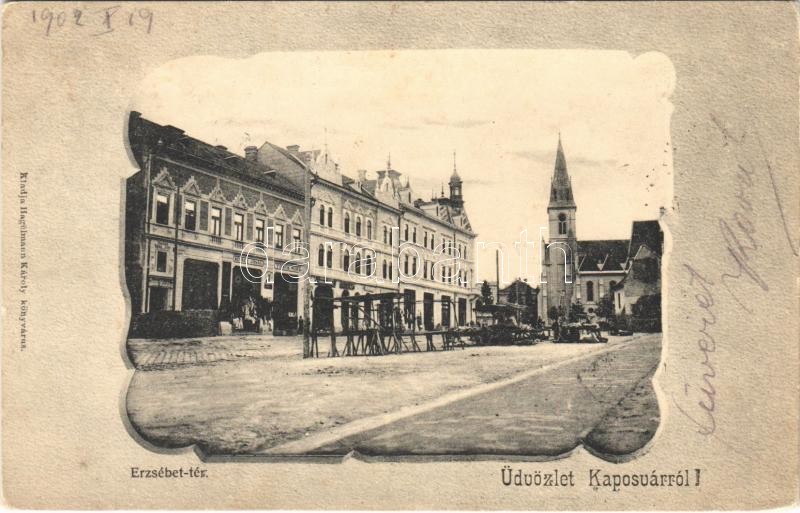 1902 Kaposvár, Erzsébet tér, templom, piac, Kovács Jónás, Török Mór üzlete. Hagelman Károly kiadása
