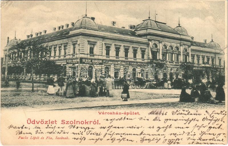 1902 Szolnok, Városháza, piac, Sebők Nándor, Konsitzky György, Fuchs Lipót és Fia üzlete és saját kiadása (EB)
