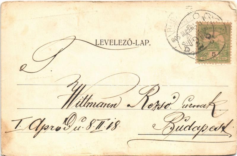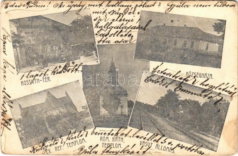 1905 Ócsa, Kossuth tér, üzlet, Községháza, Római katolikus templom, Református templom, Vasútállomás (kopott sarkak / worn corners)