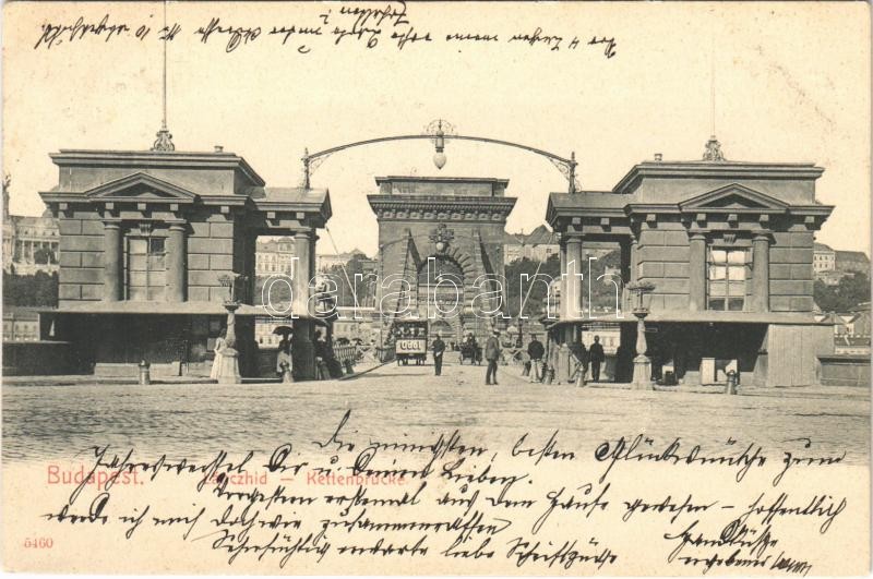1906 Budapest, Lánchíd pesti hídfője, vámházak, omnibusz Odol reklámma...