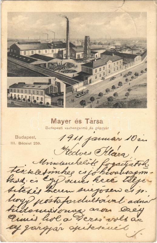 https://www.darabanth.com/en/395-Online-auction/395.0/Postcards/Hungary~1000005/1911-Budapest-III-Mayer-es-Tarsa-vashengermu-es-gepgyar-Becsi-ut-259-kis-szakadas-sma~II2401079