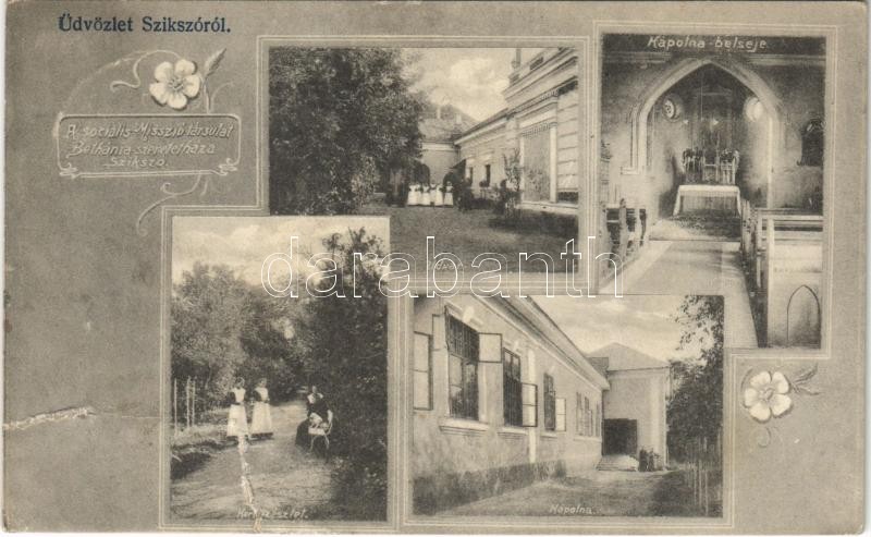 1911 Szikszó, A Szociális Misszió Társulat Bethánia szeretetháza, belső, udvar, kápolna, kert. Art Nouveau, floral, Stamberger Márk kiadása (szakadások / tears)