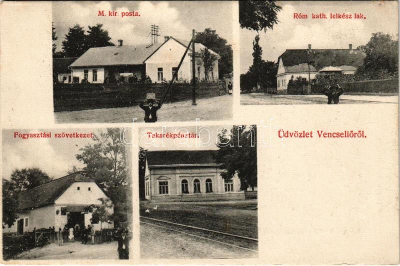 Description: 1917 Gávavencsellő, Vencsellő; M. kir. posta, Római katolikus lelkészlak, Takarékpénztár, vasúti pálya, Fogyasztási Szövetkezet üzlete. Szilágyi Arthur műintézetéből (ragasztónyom / glue mark)