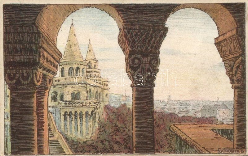 1918 Budapest I. Halászbástya. O.M. Kir. Iparművészeti Iskola. Magyar Iskola Egyesület / Ungarische Werkstätte, litho s: Schober B.