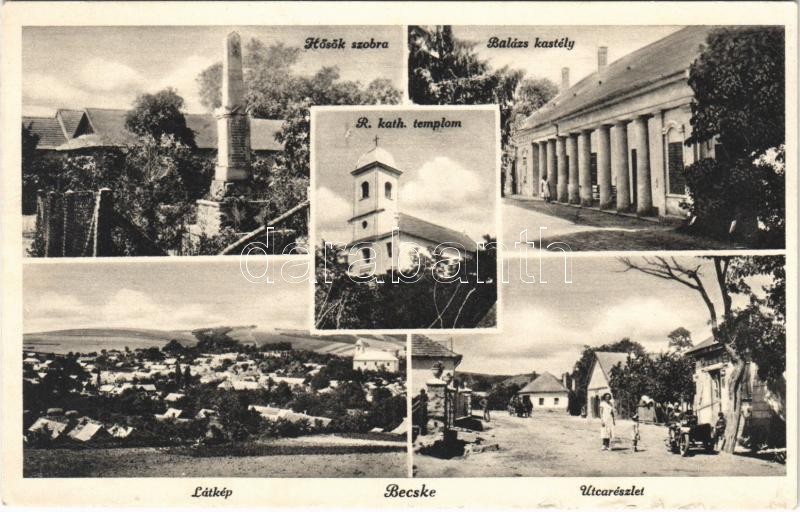 1932 Becske, Római katolikus templom, Hősök szobra, Balázs kastély, ut...
