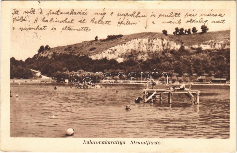 1938 Balatonakarattya, strandfürdő, fürdőzők, stég + "KESZTHELY -...