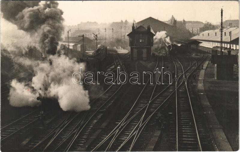 1939 Budapest VI. Nyugati pályaudvar, vasútállomás vágányokkal és gőzmozdonnyal. photo