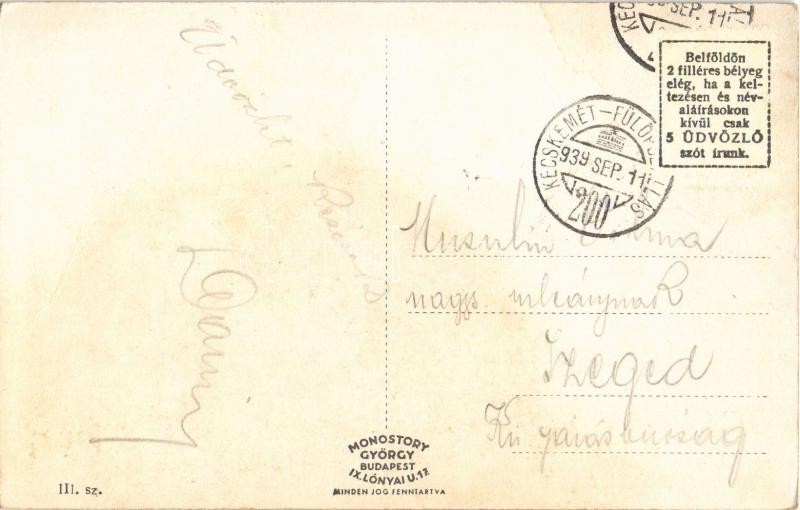 1939 Izsák, Református templom és iskola, Szabadság tér, Piactér, üzletek, Hősök szobra, emlékmű + "KECSKEMÉT - FÜLÖPSZÁLLÁS 200" vasúti mozgóposta bélyegző (fl)