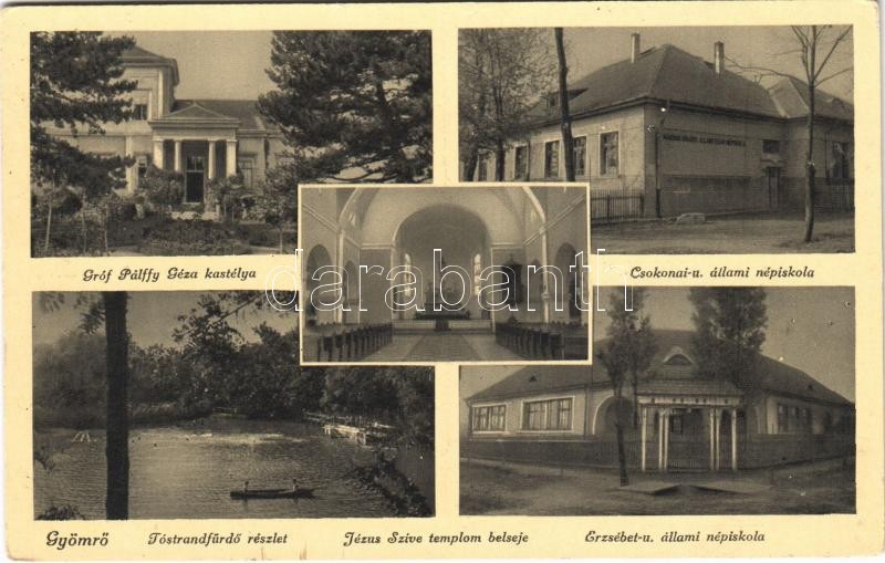 1940 Gyömrő, Gróf Pálffy Géza kastélya, Csokonai utcai állami népiskola, Tóstrandfürdő, Jézus Szíve templom belseje, Erzsébet utcai állami népiskola