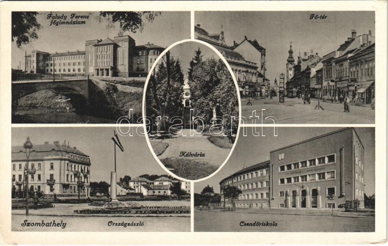 1940 Szombathely, Faludy Ferenc főgimnázium, híd, Fő tér, üzletek, Országzászló, Kálvária, Csendőriskola (EK)