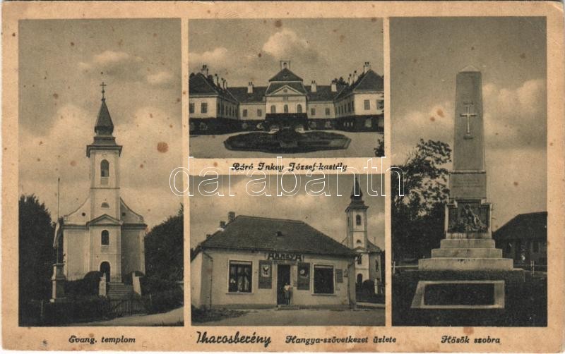 Description: 1944 Iharosberény, Evangélikus templom, Báró Inkey József kastély, Hősök szobra, emlékmű, Hangya szövetkezet üzlete és saját kiadása (ázott / wet damage)