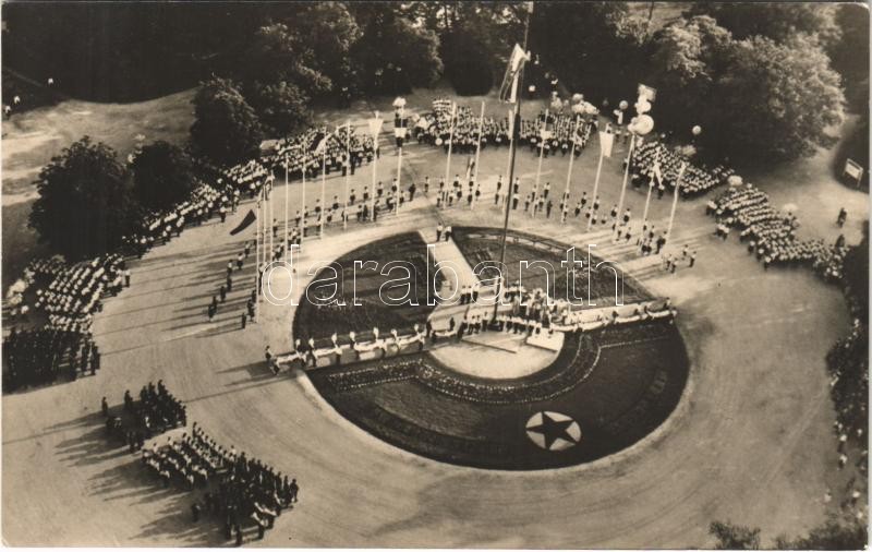 1963 Budapest XII. Csillebérc, Úttörő Nagytábor, zászlófelvonás. Képző...
