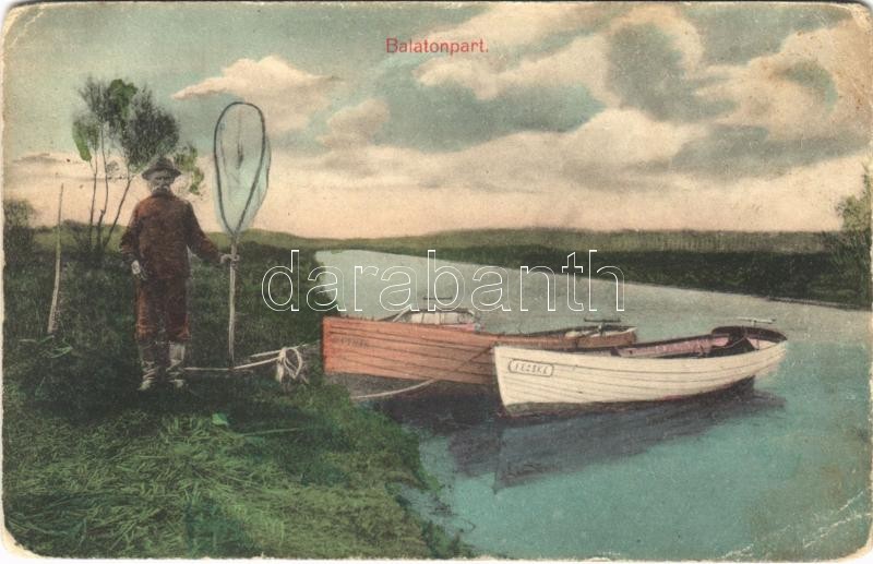 Balaton, part, "Fecske" csónak, halász hálóval. Mérei Ignác 911. 1912. (EK)