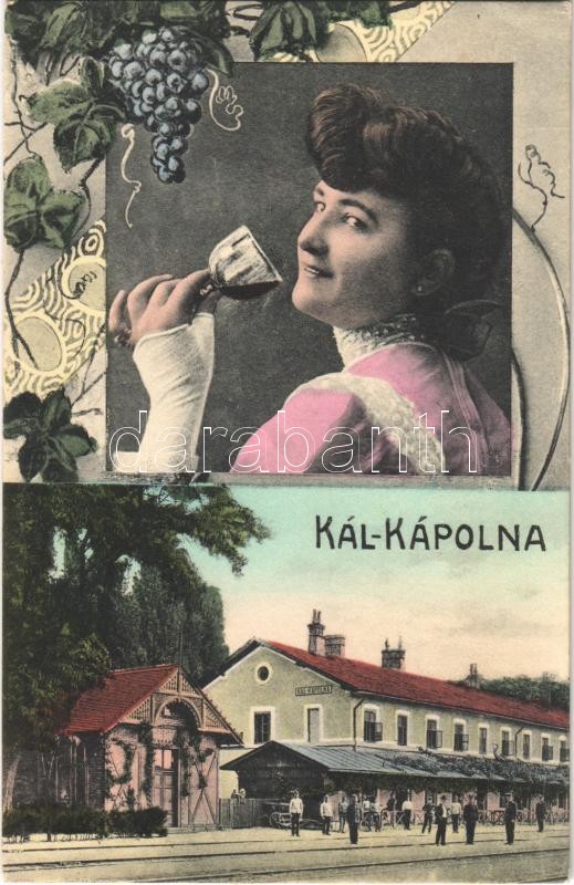 Kál-Kápolna, vasútállomás. Szőlőfürtös montázs borozó hölggyel