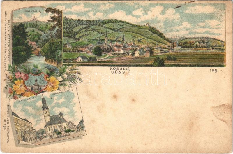 Kőszeg, Kálvária, Belváros, látkép, vasútállomás, gőzmozdony, vonat, címer. Kőszegi József kiadása. Art Nouveau, floral, litho (fl)