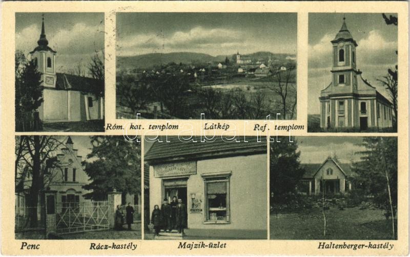 Penc, Római katolikus és református templom, Rácz és Haltenberger kastély, Majzik Viktor üzlete és saját kiadása