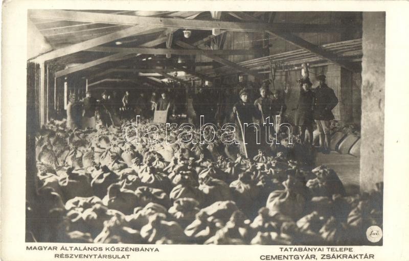 Tatabánya, Magyar Általános Kőszénbánya Rt. tatabányai telepe, Cementgyár, zsákraktár, belső munkásokkal, gyerekmunkásokkal. Lux photo