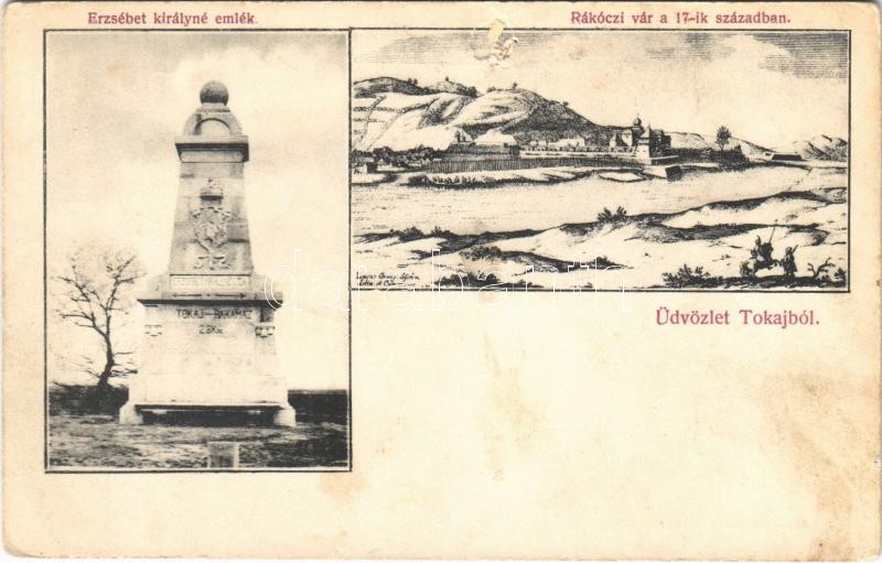 Tokaj, Erzsébet királyné emlékmű, Rákóczi vár a 17. században. Gestetn...